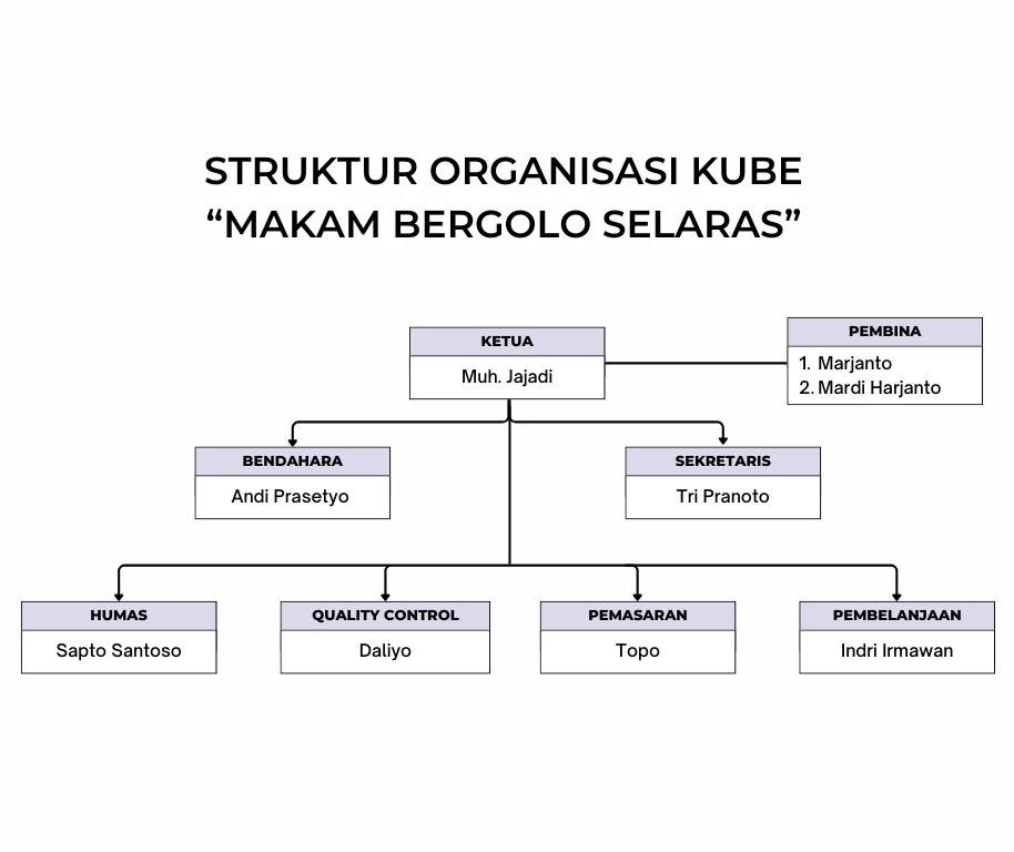 Dengan struktur yang tertata ini, diharapkan koordinasi antar anggota dapat berjalan efektif serta mampu menunjang keberlanjutan program dan kegiatan usaha kelompok. Berikut adalah struktur organisasi KUBE “Makam Bergolo Selaras”